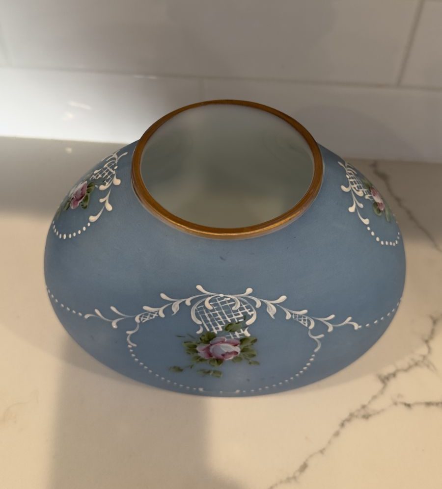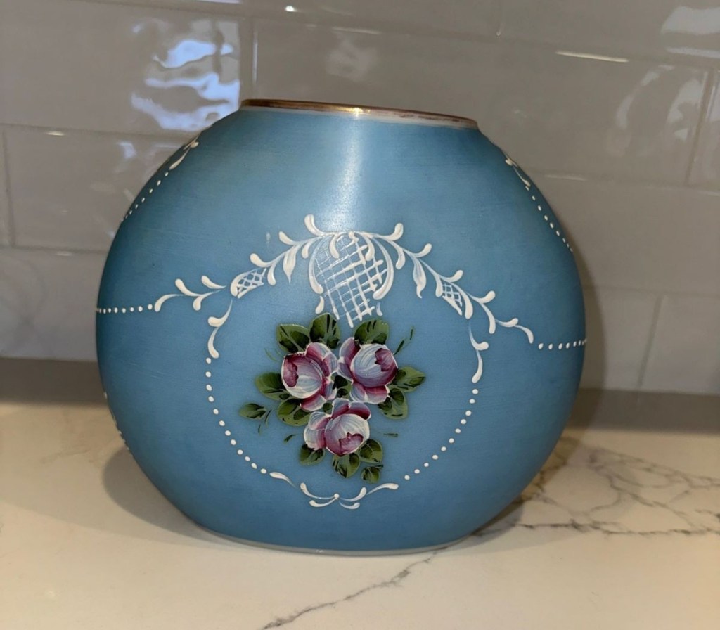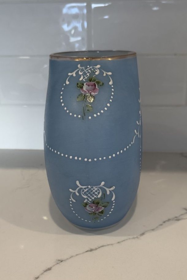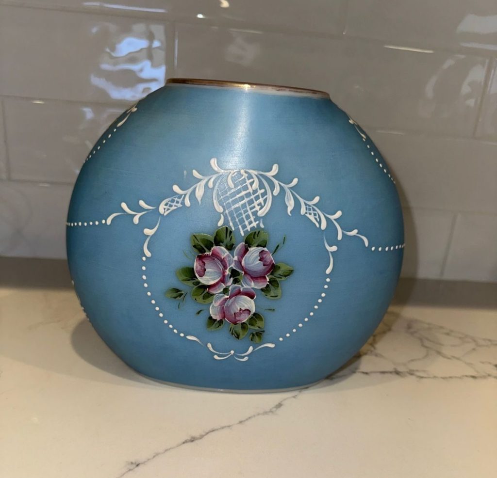 Beautiful blue satin vase with hand-painted roses and white scrollwork.