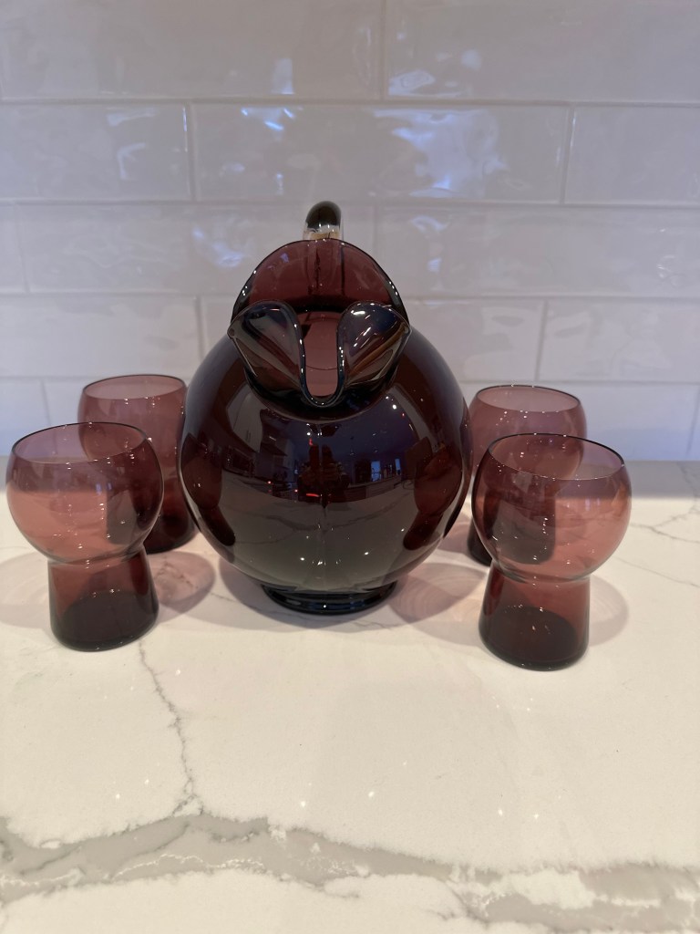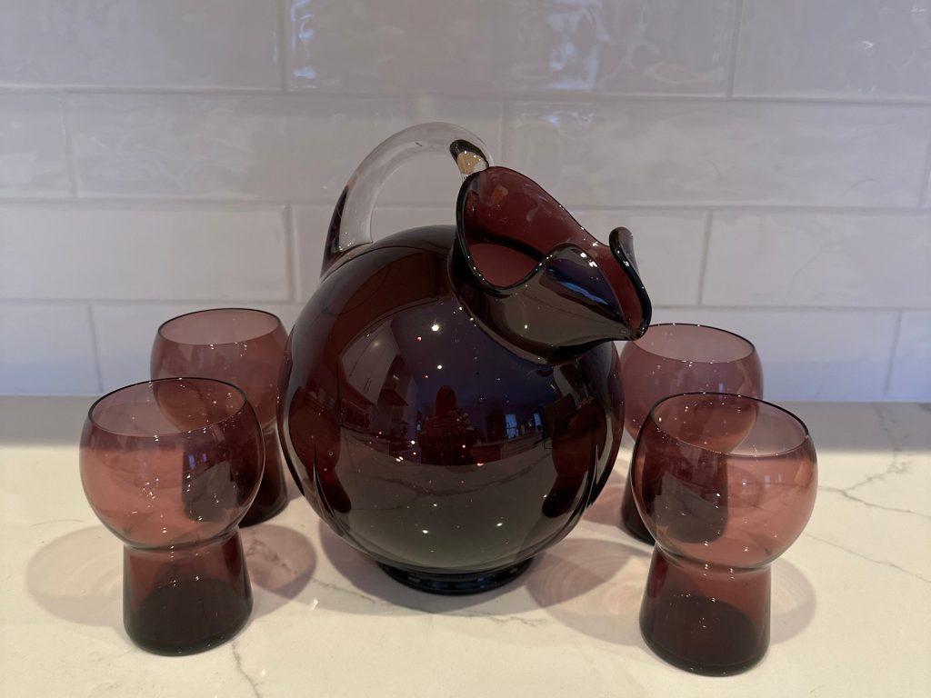 Cambridge Glass Company # 3400 Line Amethyst 80 ounce Ball Jug with ice lip and four matching amethyst glasses.