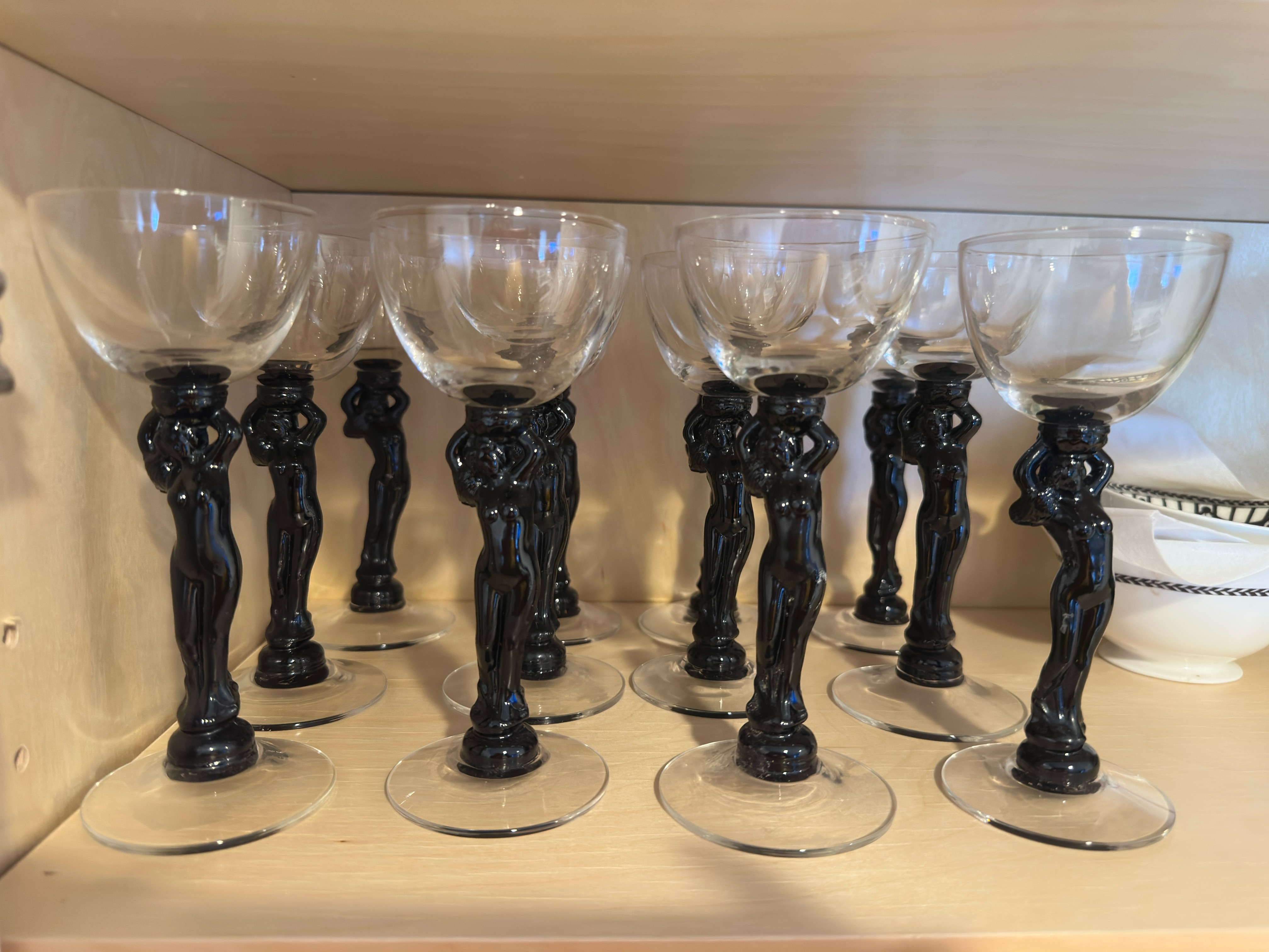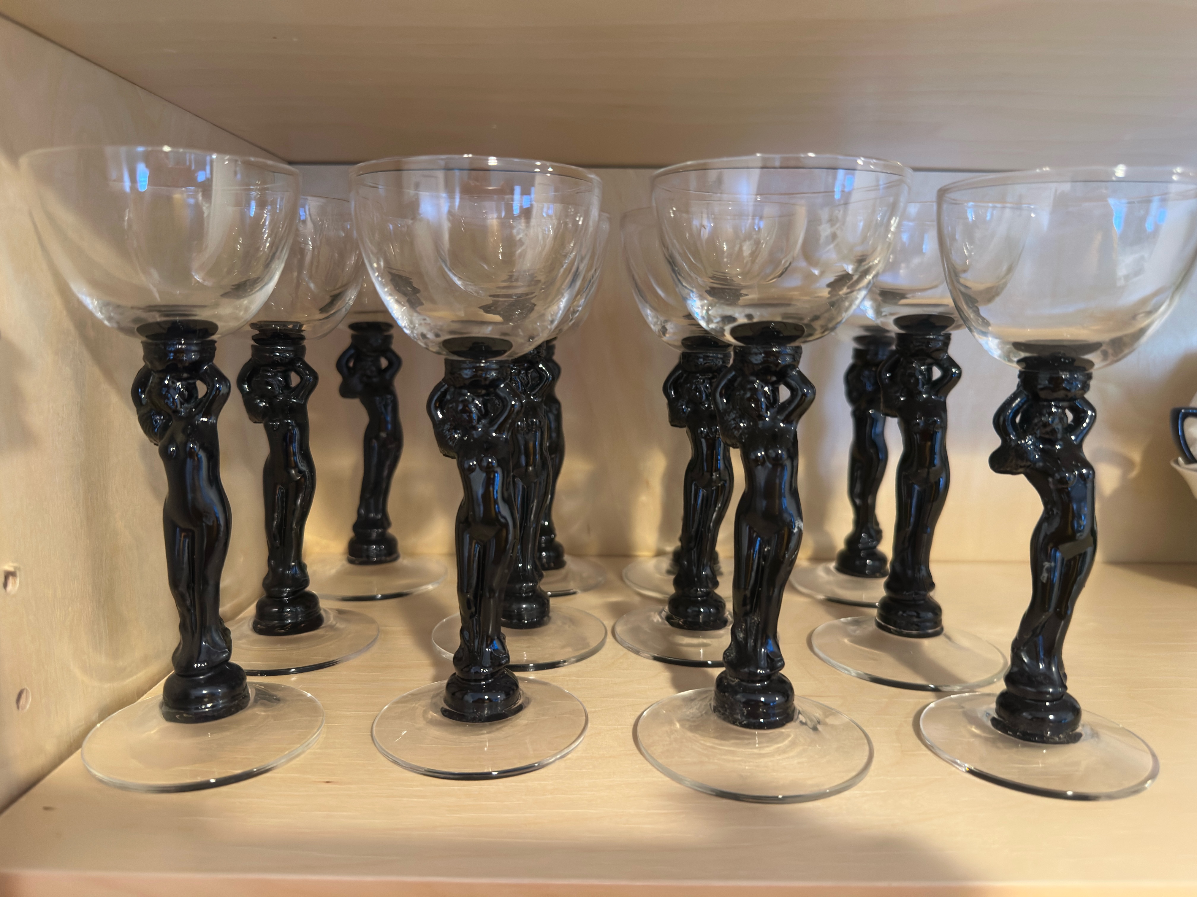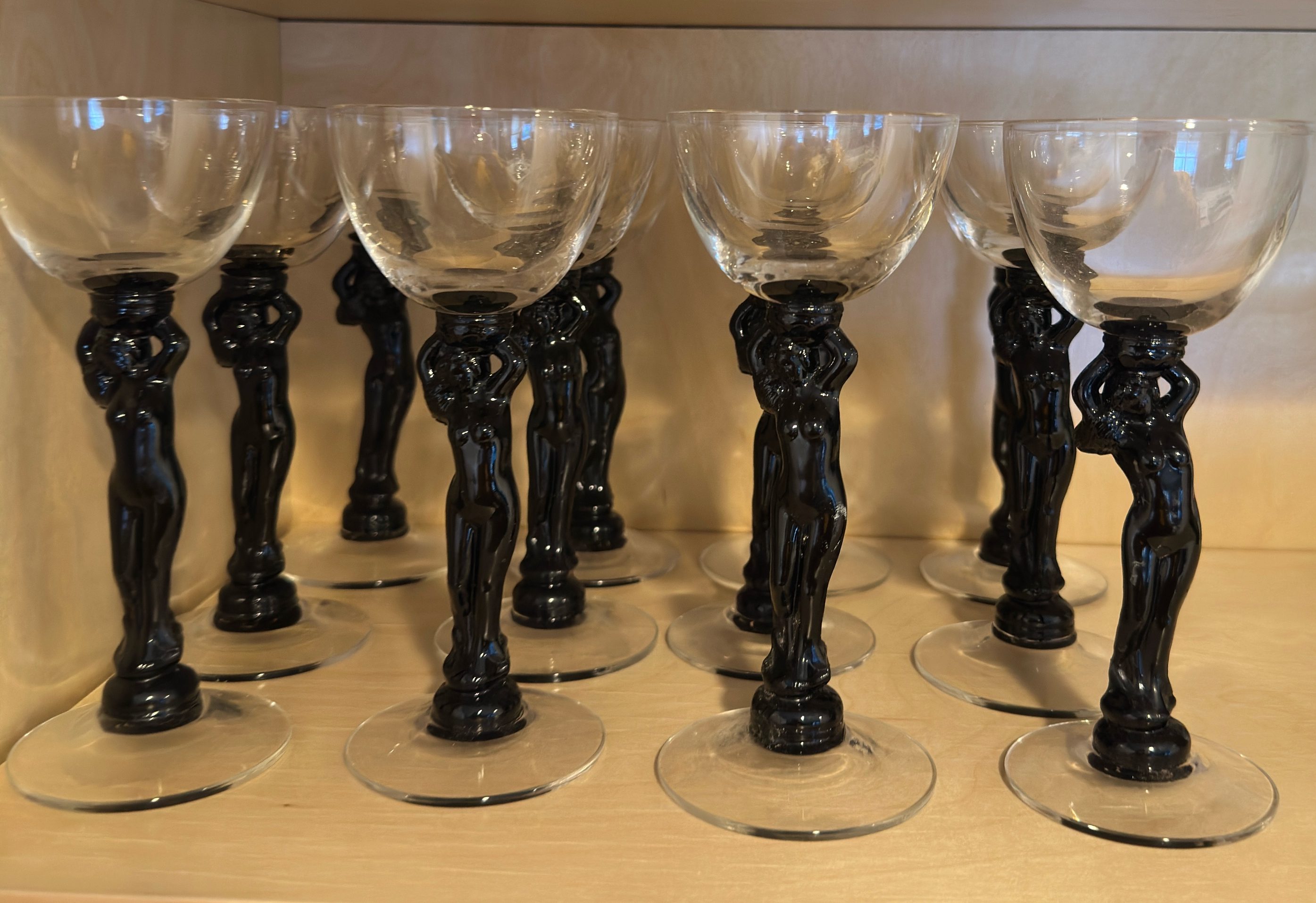 A set of 12 Cambridge Statuesque Nude Ebony Black glass stems.
