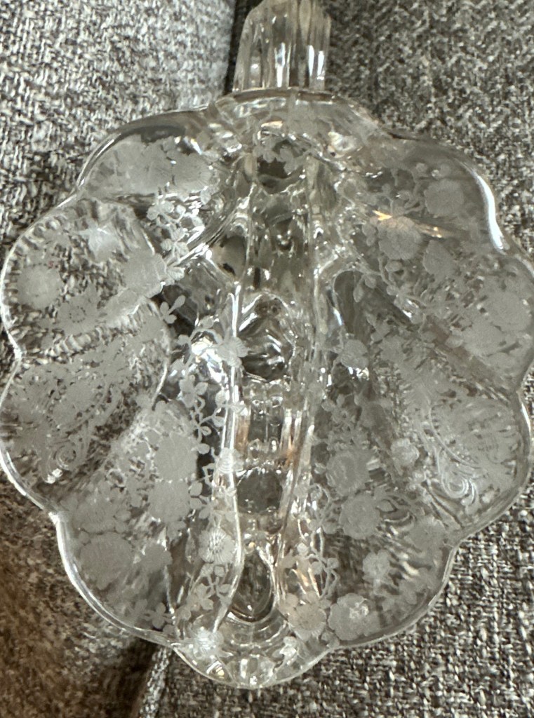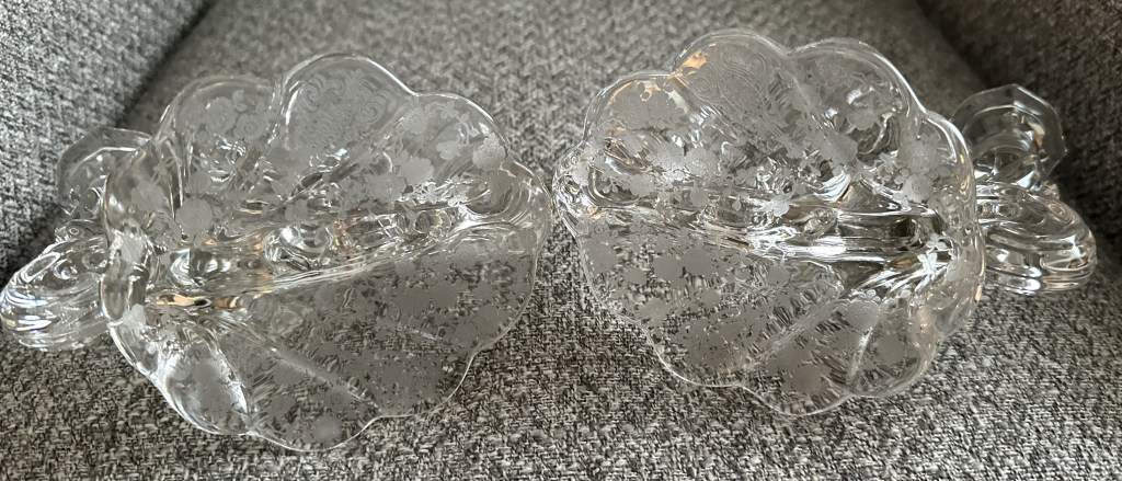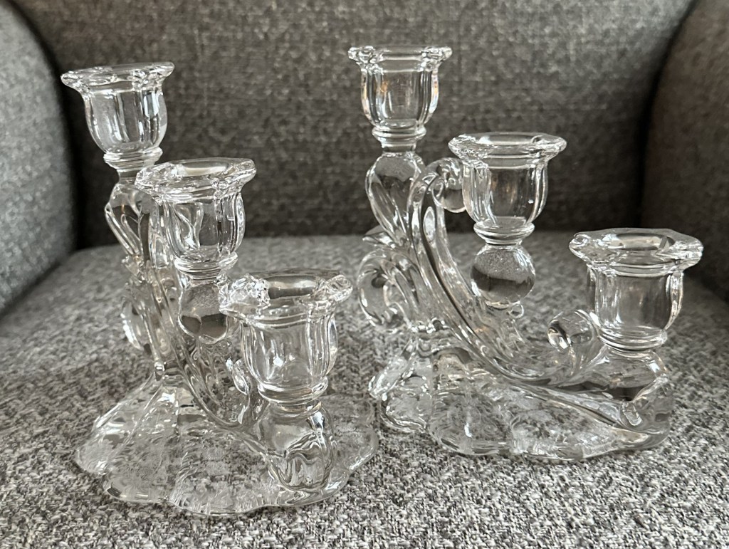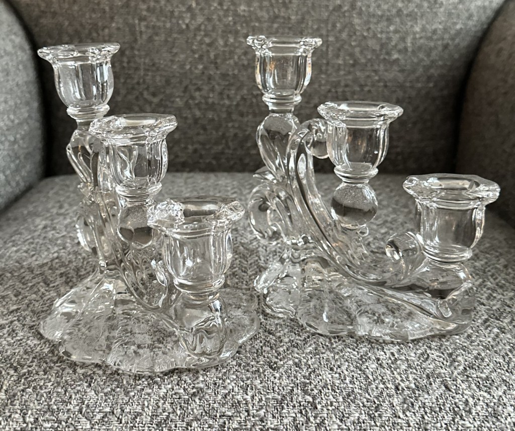 Pair of Cambridge clear glass candelabra in the Caprice pattern, Shape 3400/1338, with Rosepoint etching.