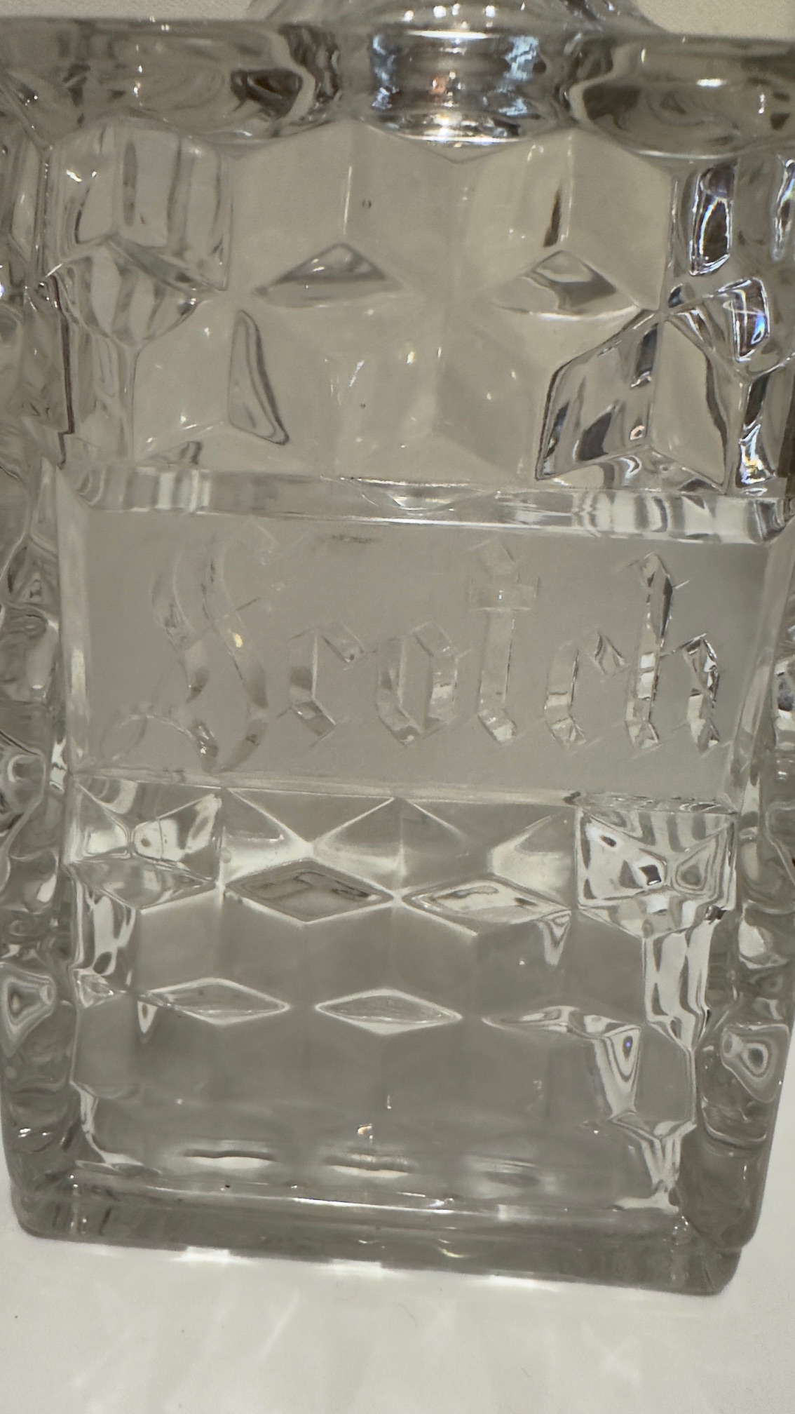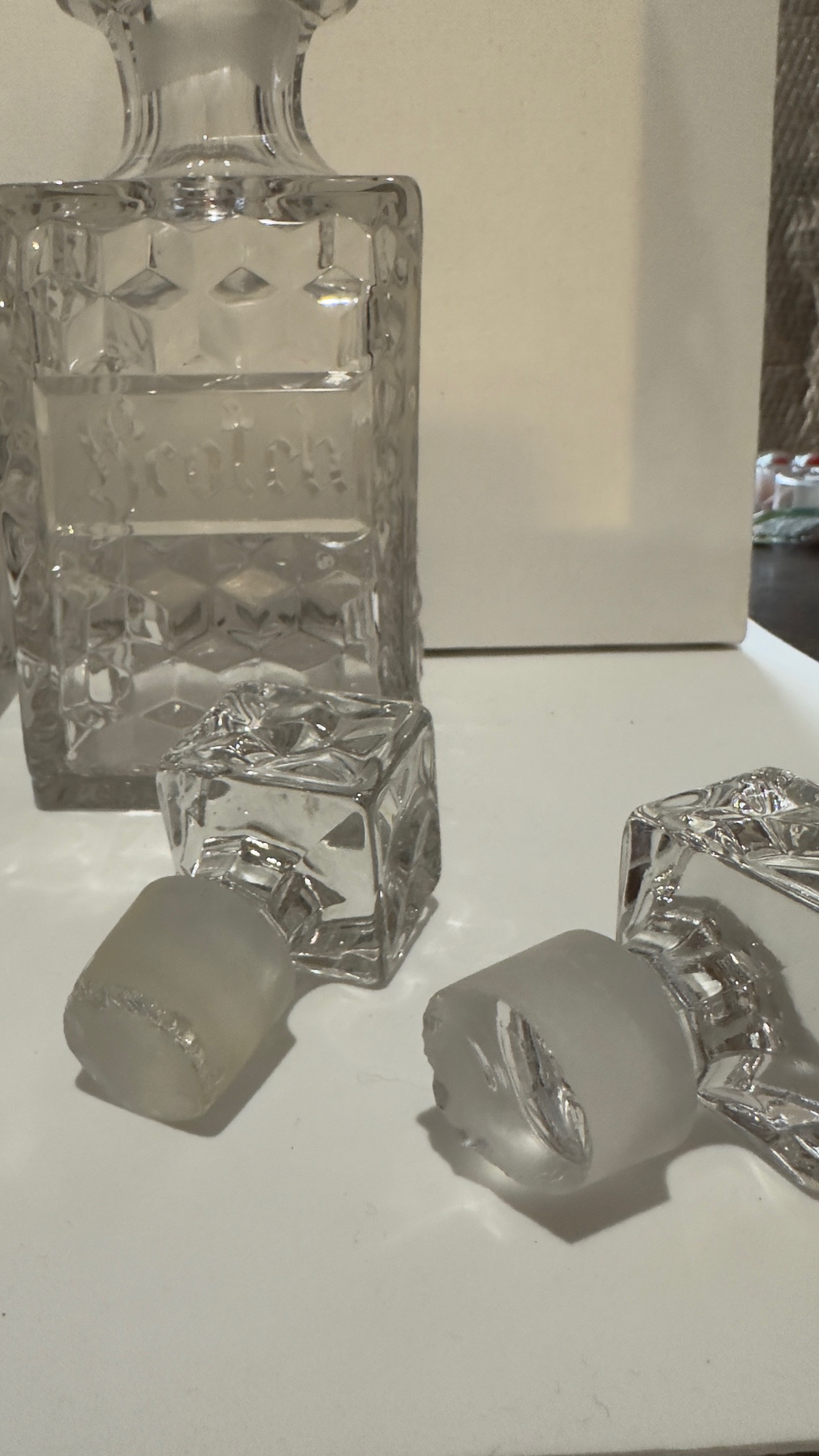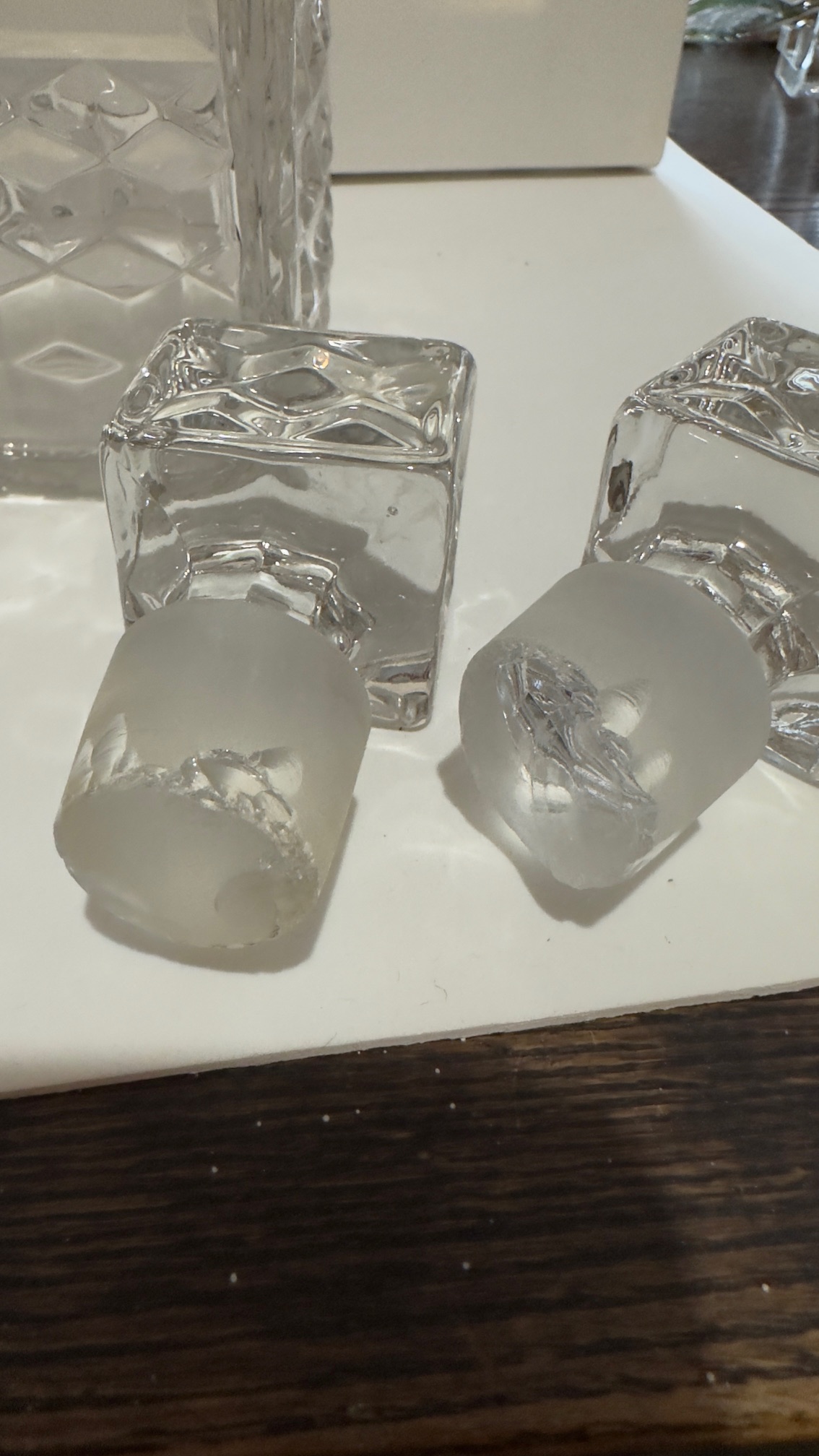 Decanter bottles are in excellent condition, with no chips, cracks, or damage. There are chips to the bases of both stoppers (see images).