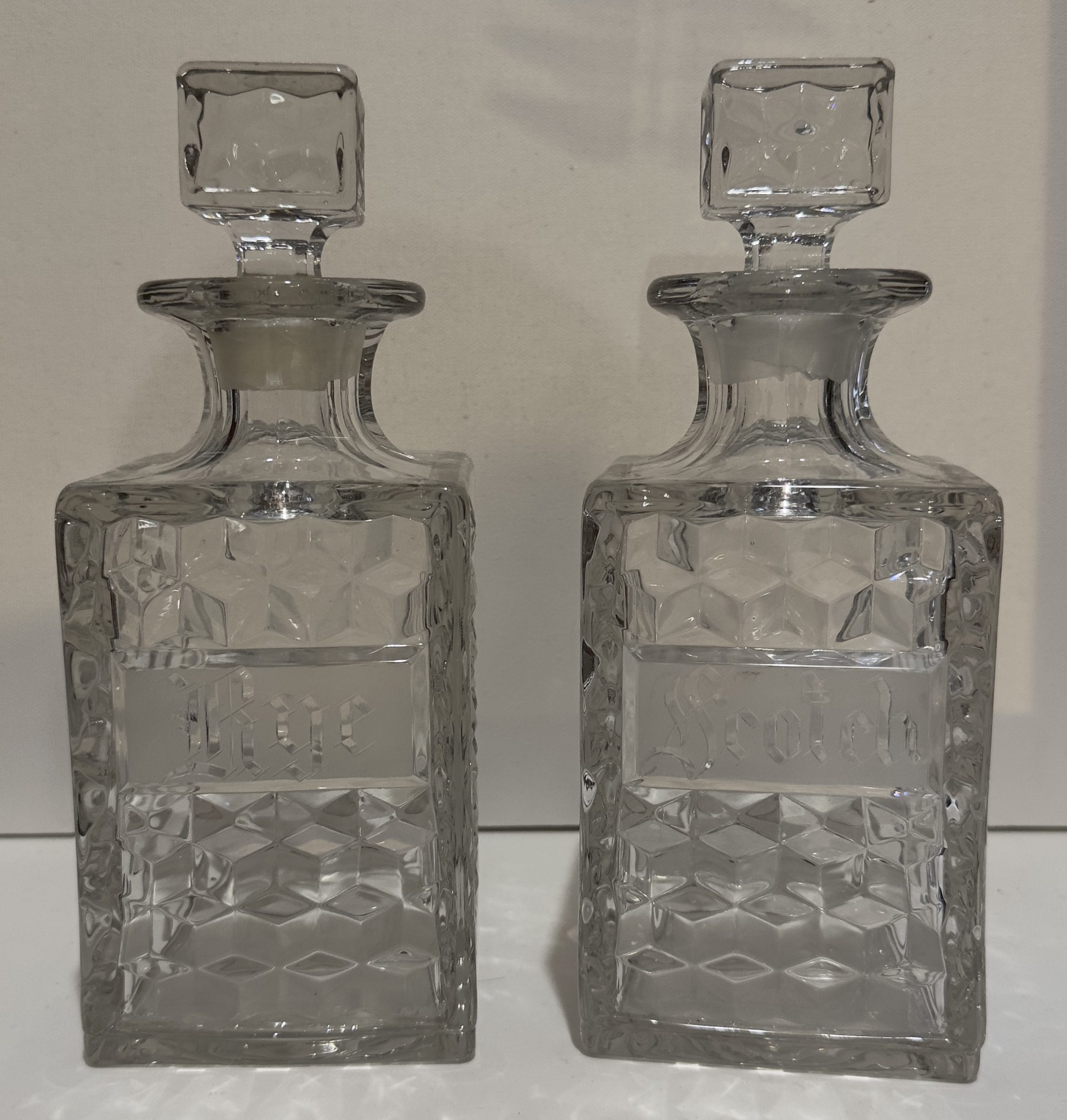 A pair of Fostoria American liquor decanters with stoppers. The decanters are etched with labels for Rye and Scotch.