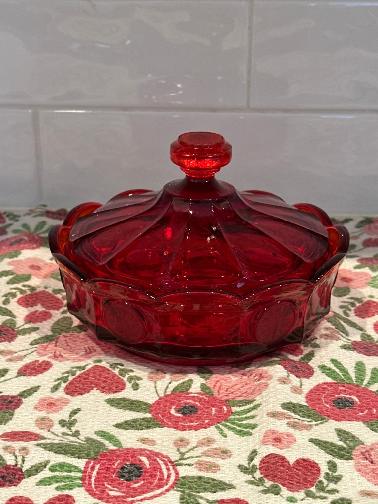 This red candy dish with cover measures 6.5″ in diameter and is 4″ tall.
