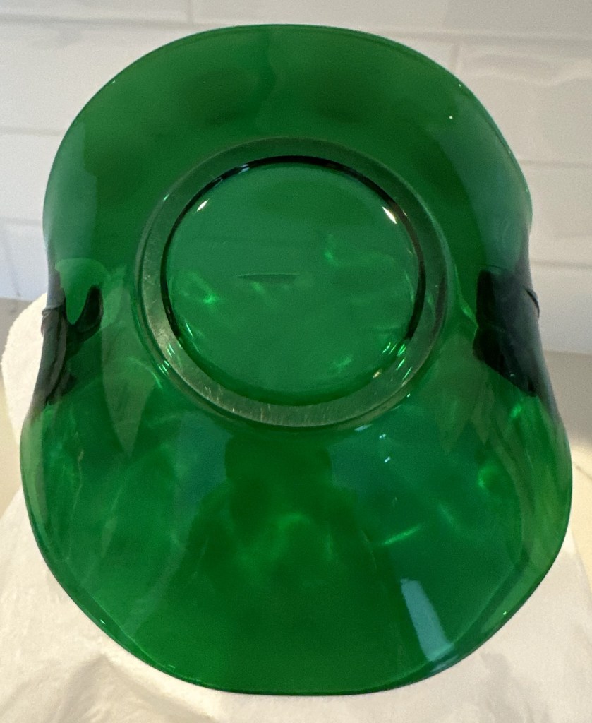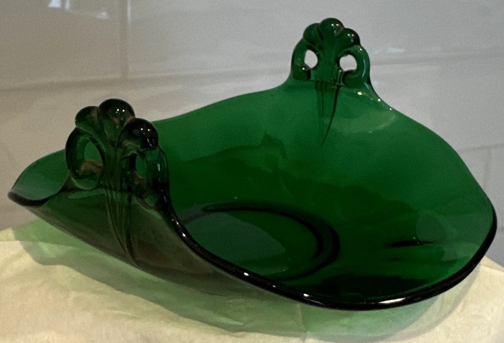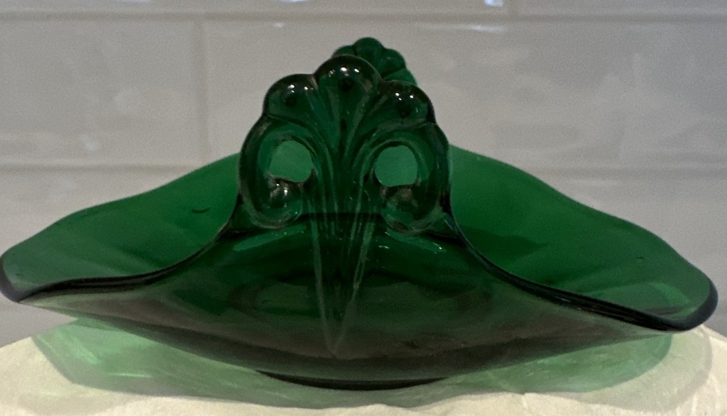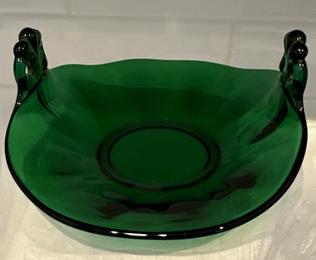 Fostoria Lafayette # 2440 Empire Green Bon Bon 5” Tab Plume Handles turned up.