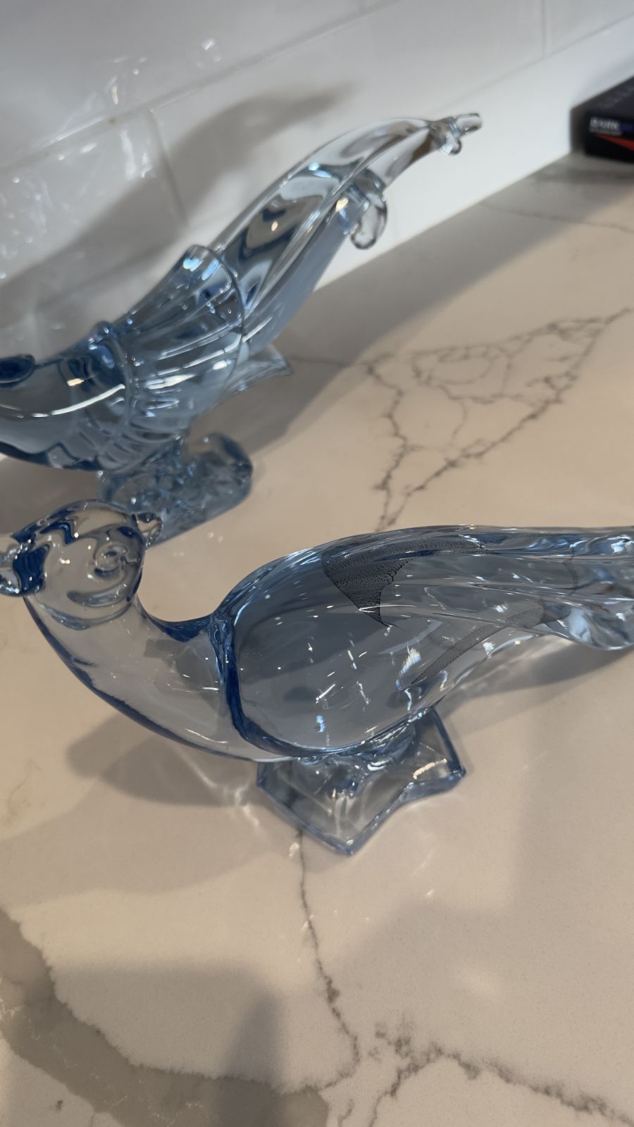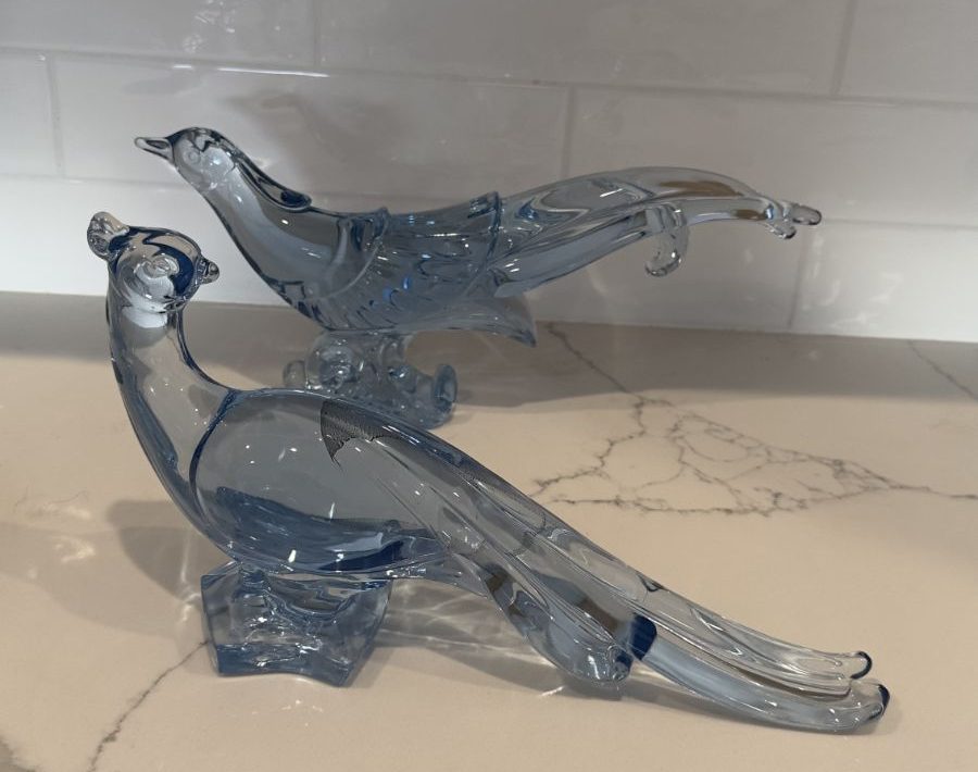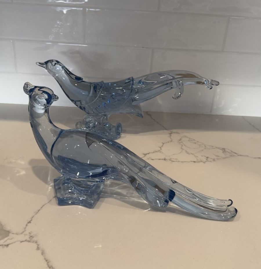 A pair of blue glass Chinese Pheasant figurines by the Paden City Glass company.