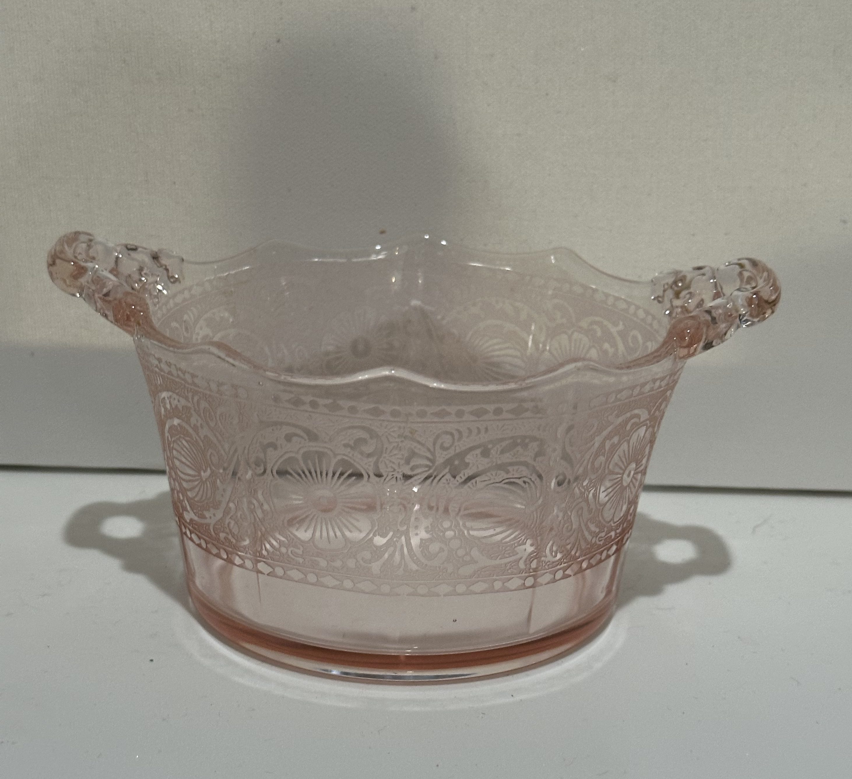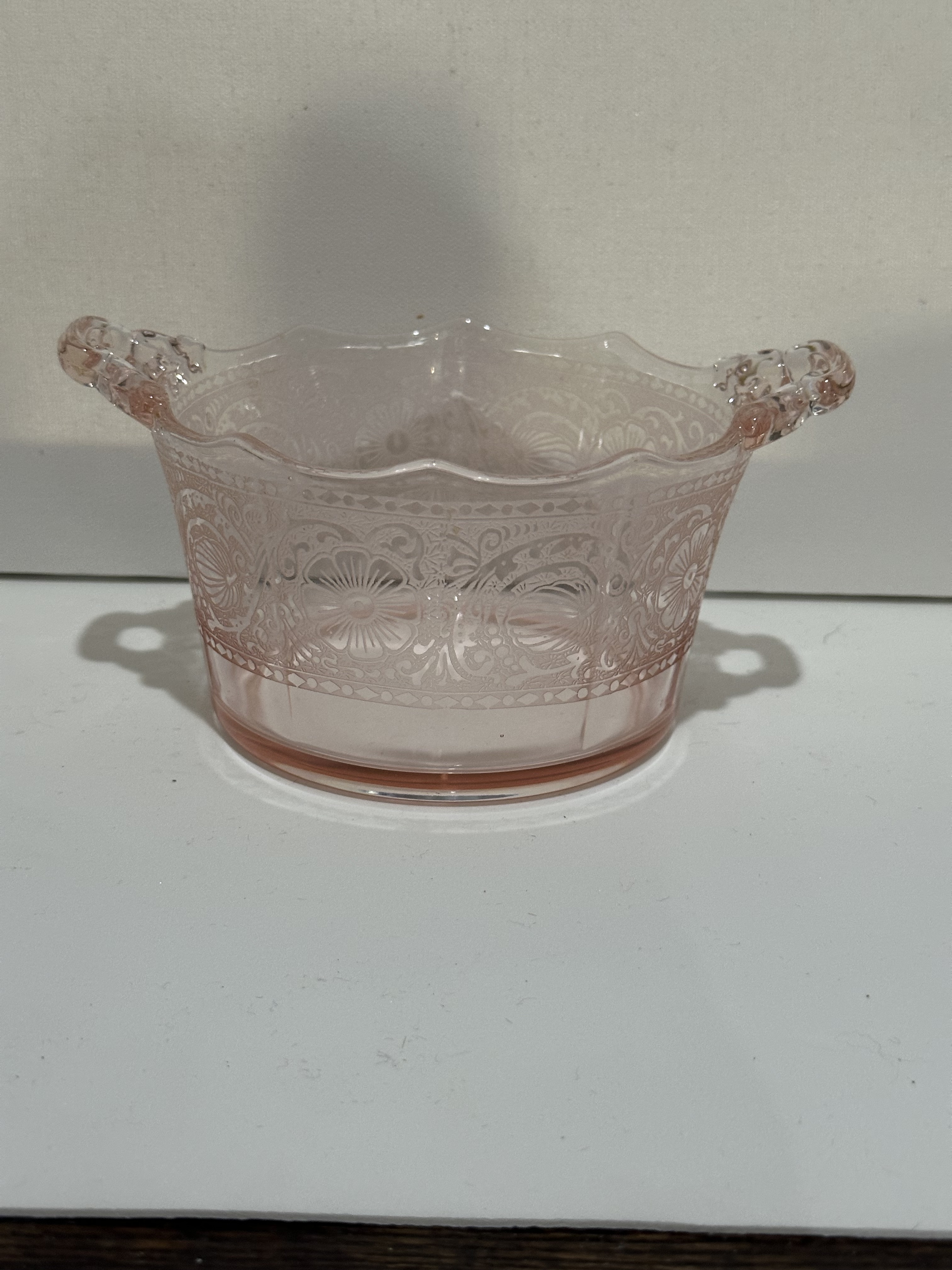 Cambridge pink whipped cream pail with etched pattern 12 Petal Daisy.