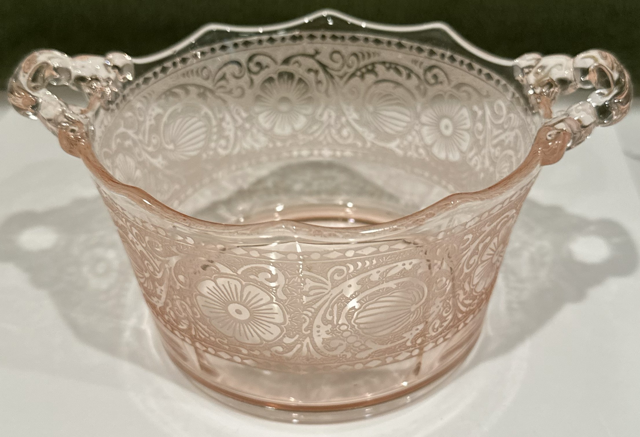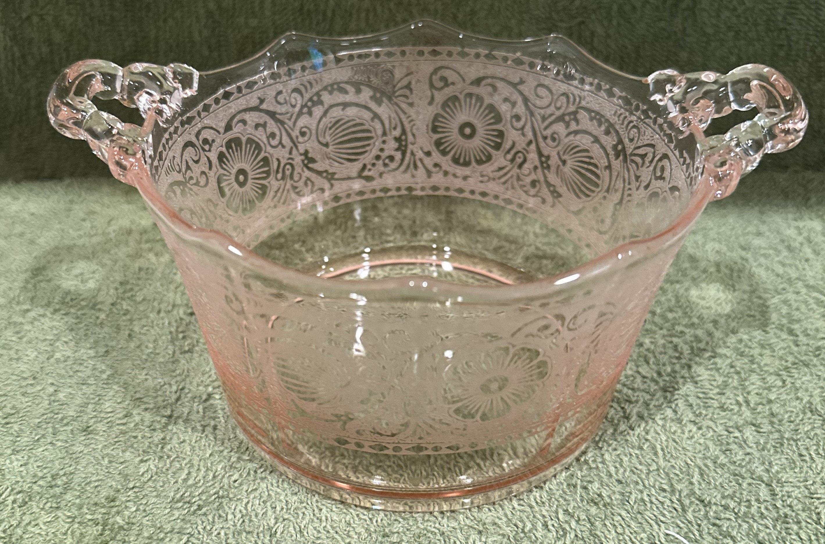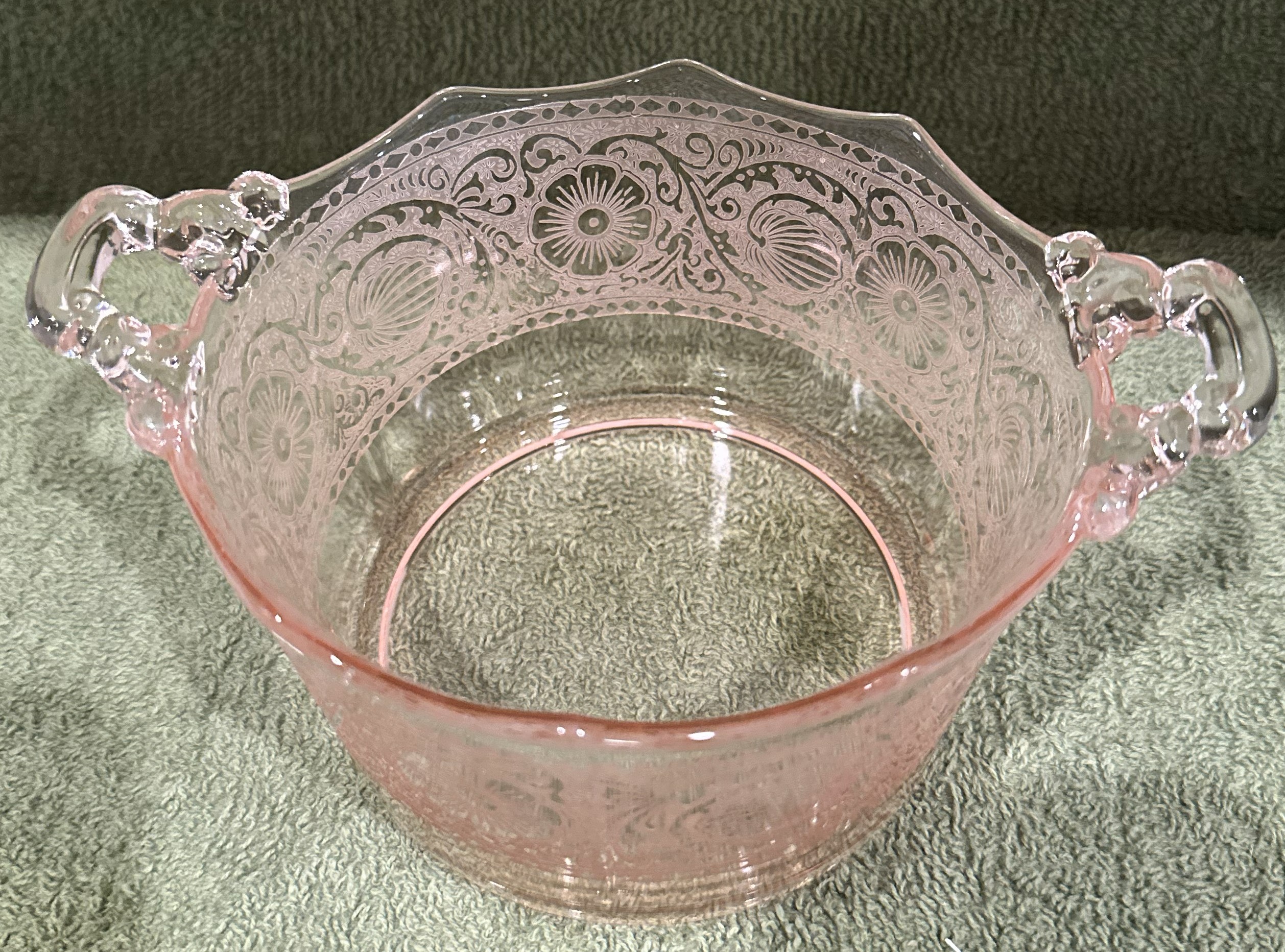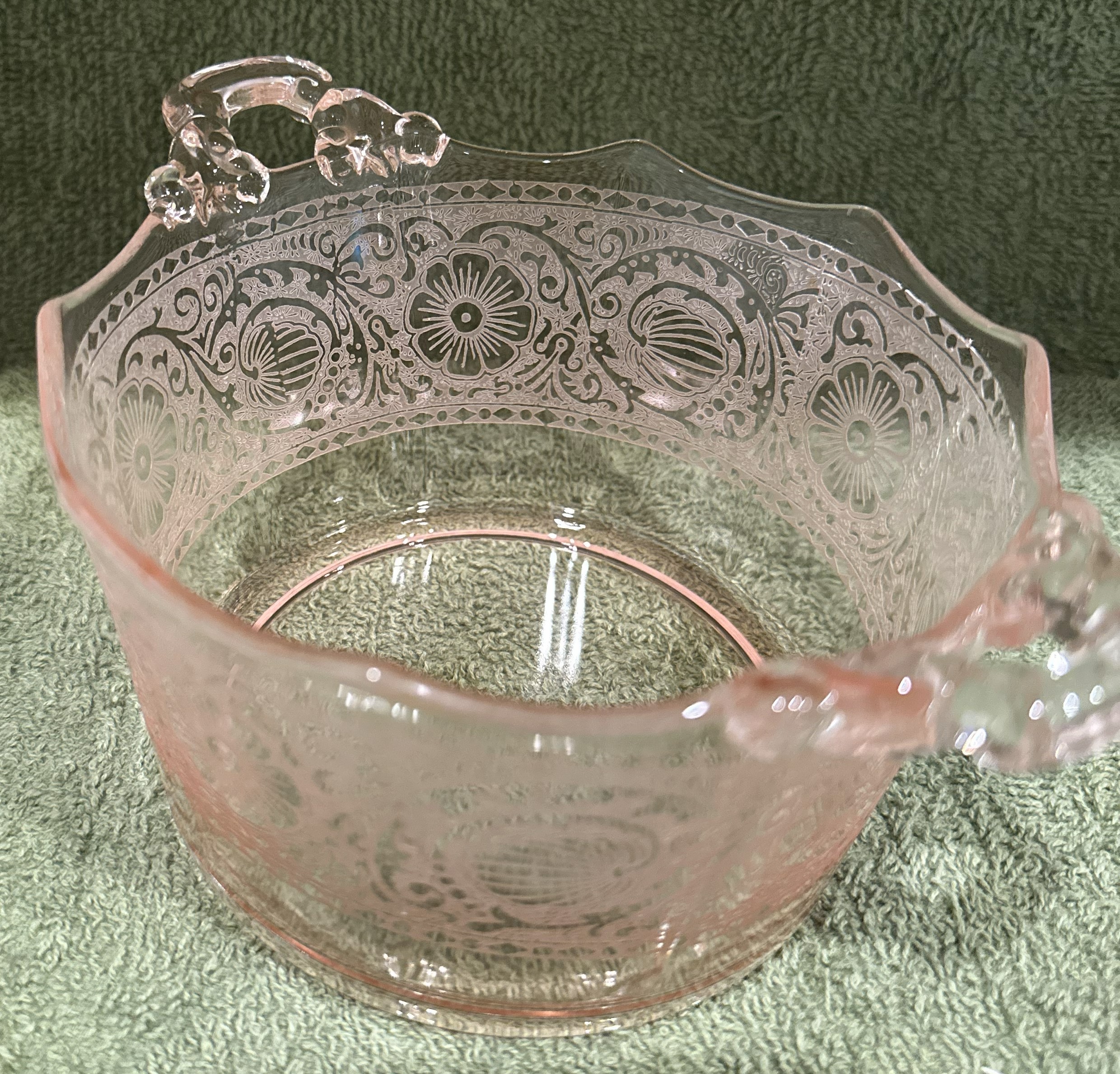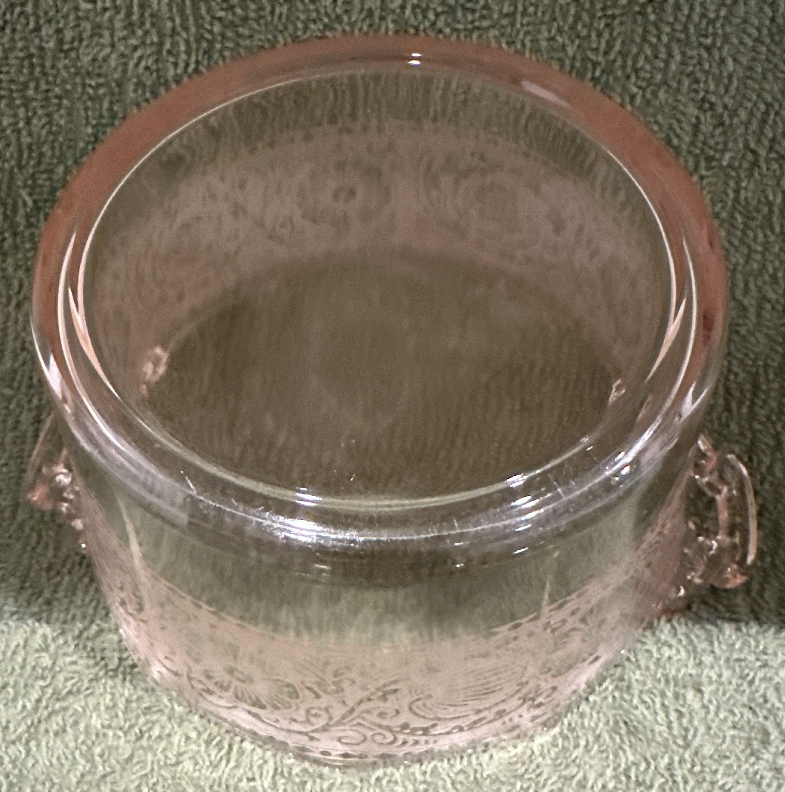 Cambridge Rare Etch# 727 Handled Glass Pink Whipped Cream Pail.